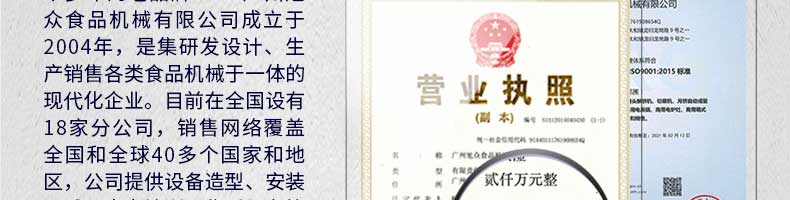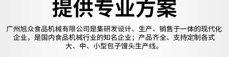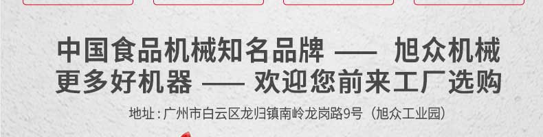 廣州旭眾食品機械有限公司是一家集科研開發,生產設計,營銷服務為一體的現代化生產企業。現代化生產車間,精湛制造技術,所產機械歷經市場重重考驗,不斷贏得海內外客戶的贊譽。