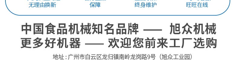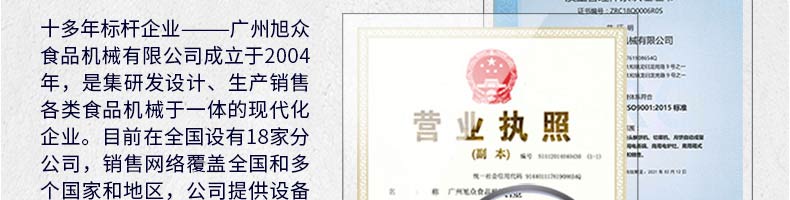 廣州旭眾食品機械有限公司是一家集科研開發,生產設計,營銷服務為一體的現代化生產企業?,F代化生產車間,精湛制造技術,所產機械歷經市場重重考驗,不斷贏得海內外客戶的贊譽。