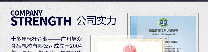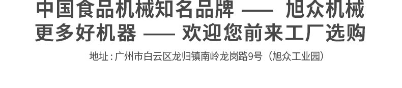 廣州旭眾食品機械有限公司是一家集科研開發,生產設計,營銷服務為一體的現代化生產企業。現代化生產車間,精湛制造技術,所產機械歷經市場重重考驗,不斷贏得海內外客戶的贊譽。