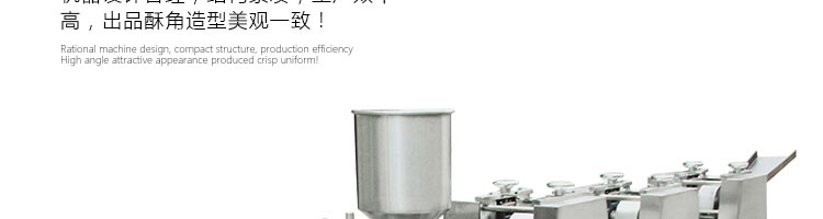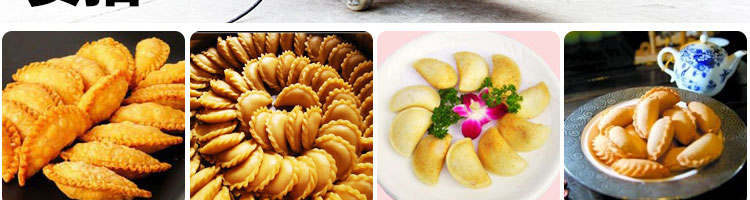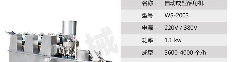 WS-2003 型自動成型酥角機(油餃機),適用于制作酥角、油餃,可包的餡有:花生、椰蓉、白糖等。適合多種面粉材料、并且成型封口美觀牢固。小模約47mm,大模約57mm隨機標配一套模具。購機贈送工藝配方。