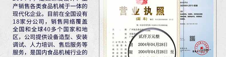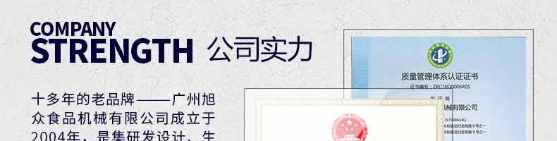 廣州旭眾食品機(jī)械有限公司是一家集科研開發(fā),生產(chǎn)設(shè)計,營銷服務(wù)為一體的現(xiàn)代化生產(chǎn)企業(yè)。現(xiàn)代化生產(chǎn)車間,精湛制造技術(shù),所產(chǎn)機(jī)械歷經(jīng)市場重重考驗,不斷贏得海內(nèi)外客戶的贊譽。