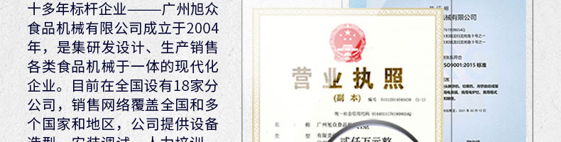 廣州旭眾食品機械有限公司是一家集科研開發,生產設計,營銷服務為一體的現代化生產企業。現代化生產車間,精湛制造技術,所產機械歷經市場重重考驗,不斷贏得海內外客戶的贊譽。