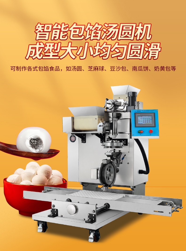 ◆送面、送餡均采用四絞龍結構,數字變頻調控,可任意調節面、餡輸送量及湯圓重量。可自動搓圓、成型,制品不易變形