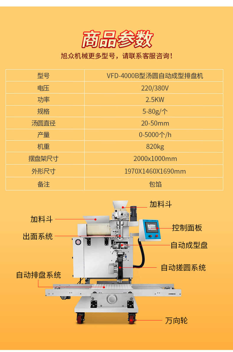 下面是VFD-4000B型湯圓自動成型排盤機產品詳情