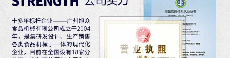 廣州旭眾食品機械有限公司是一家集科研開發,生產設計,營銷服務為一體的現代化生產企業。現代化生產車間,精湛制造技術,所產機械歷經市場重重考驗,不斷贏得海內外客戶的贊譽。