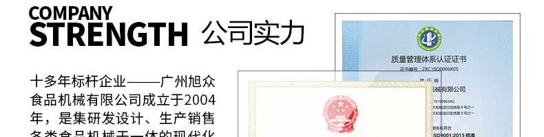 廣州旭眾食品機械有限公司是一家集科研開發,生產設計,營銷服務為一體的現代化生產企業?,F代化生產車間,精湛制造技術,所產機械歷經市場重重考驗,不斷贏得海內外客戶的贊譽。