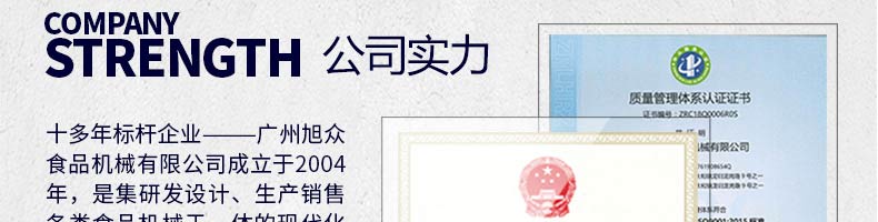 廣州旭眾食品機械有限公司是一家集科研開發(fā),生產(chǎn)設計,營銷服務為一體的現(xiàn)代化生產(chǎn)企業(yè)。現(xiàn)代化生產(chǎn)車間,精湛制造技術,所產(chǎn)機械歷經(jīng)市場重重考驗,不斷贏得海內(nèi)外客戶的贊譽。